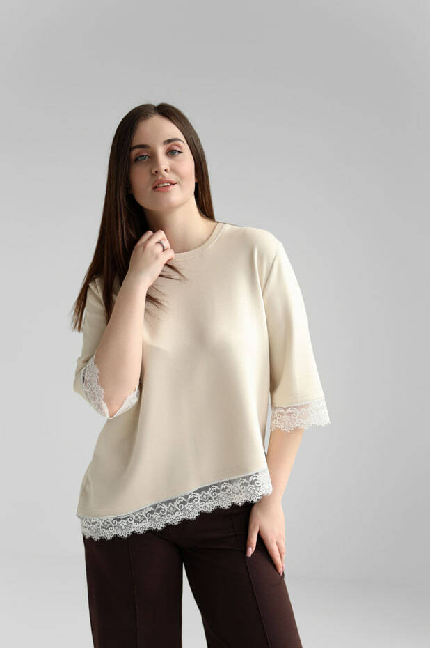 Стильна блуза, яка поєднує комфорт і витончені деталі — ідеальний вибір для повсякденних та офісних образів.Виготовлена з якісної тканини дайвінг, вона приємна до тіла, добре тримає форму та не мнеться. Матеріал еластичний, забезпечує комфортну посадку та свободу рухів протягом усього дня. Модель має делікатні акценти: мереживне оздоблення на рукавах і по низу додає жіночності та легкості, а асиметричний крій низу створює сучасний, стильний силует. Характеристики: Тканина: дайвінг Склад: 100% поліестер Силует: напіввільний Горловина: кругла Декор: мереживо по низу та на рукавах Особливість: асиметричний низ Ідеально поєднується як з класичними брюками, так і з джинсами, створюючи елегантний і водночас невимушений образ.