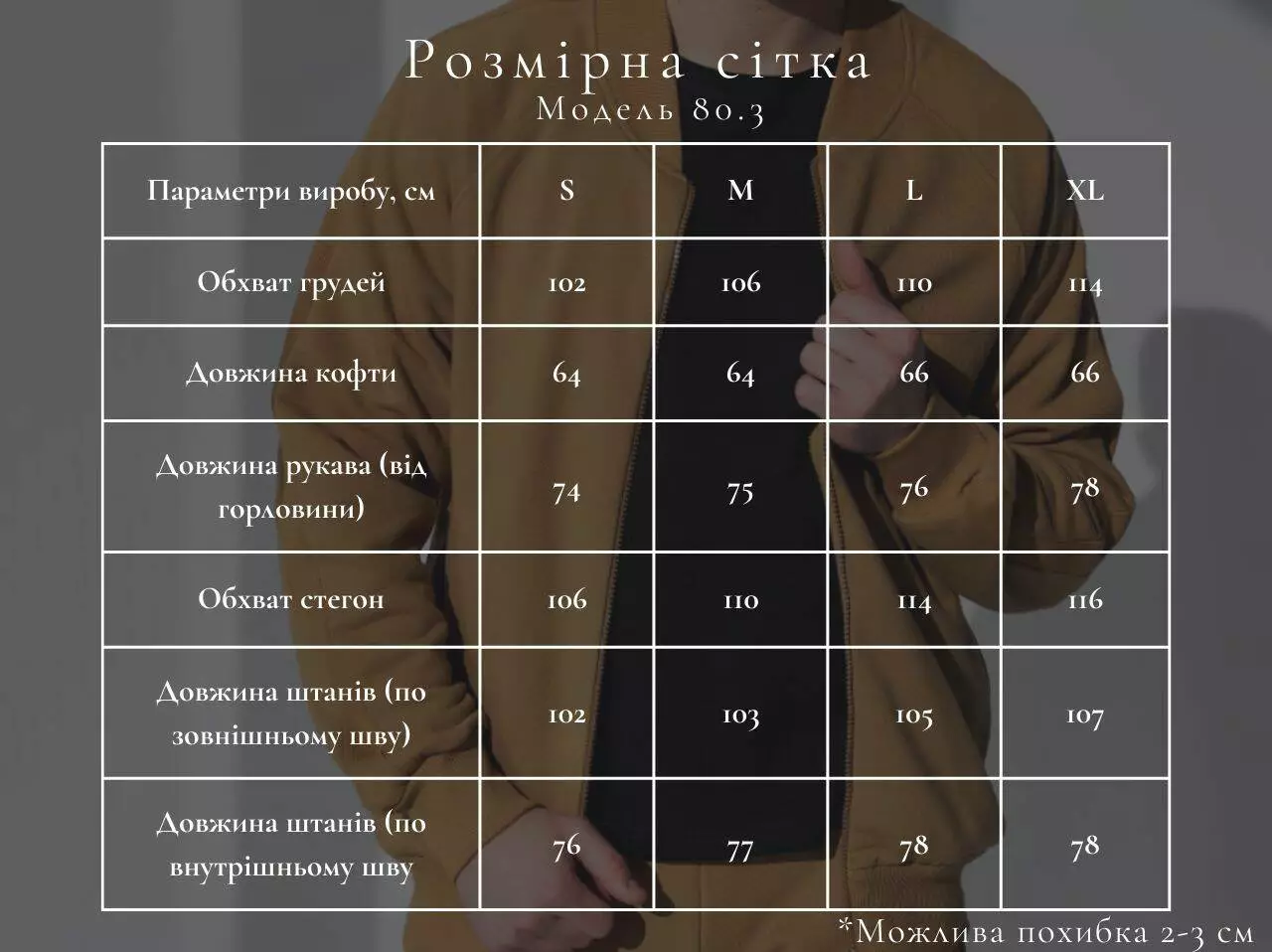 Чоловічий костюм з тринитки на замку зі стійкою та джогерами — надійний вибір для комфорту і стилю Теплий та зручний чоловічий спортивний костюм із щільної тринитки — ідеальний для прохолодної пори року. Модель включає кофту на блискавці з коміром-стійкою та штани-джогери з еластичним поясом і кишенями. Кофта має повноцінну застібку-блискавку, акуратний комір-стійку замість капюшона, а також зручні бічні кишені. Вона надає образу стриманого спортивного стилю з легким акцентом на практичність. Добре тримає форму та зберігає тепло завдяки внутрішньому начосу. Штани-джогери мають сучасний крій із завуженням донизу, еластичний пояс із зав’язками, бічні кишені та манжети по низу. Зручні в носінні, не сковують рухів і виглядають стильно як з кросівками, так і з повсякденним взуттям. Костюм легко поєднується з іншими елементами гардеробу та ідеально підходить для прогулянок, поїздок, занять спортом або просто для повсякденного комфорту. Переваги: Щільна тринитка з начосом — тепло і зносостійкість Кофта на блискавці з коміром-стійкою Джогери з кишенями, поясом на резинці та манжетами Сучасний крій і зручна посадка Підходить для осінньо-зимового сезону Цей костюм — ідеальний вибір для активних чоловіків, які цінують комфорт і стриманий стиль!