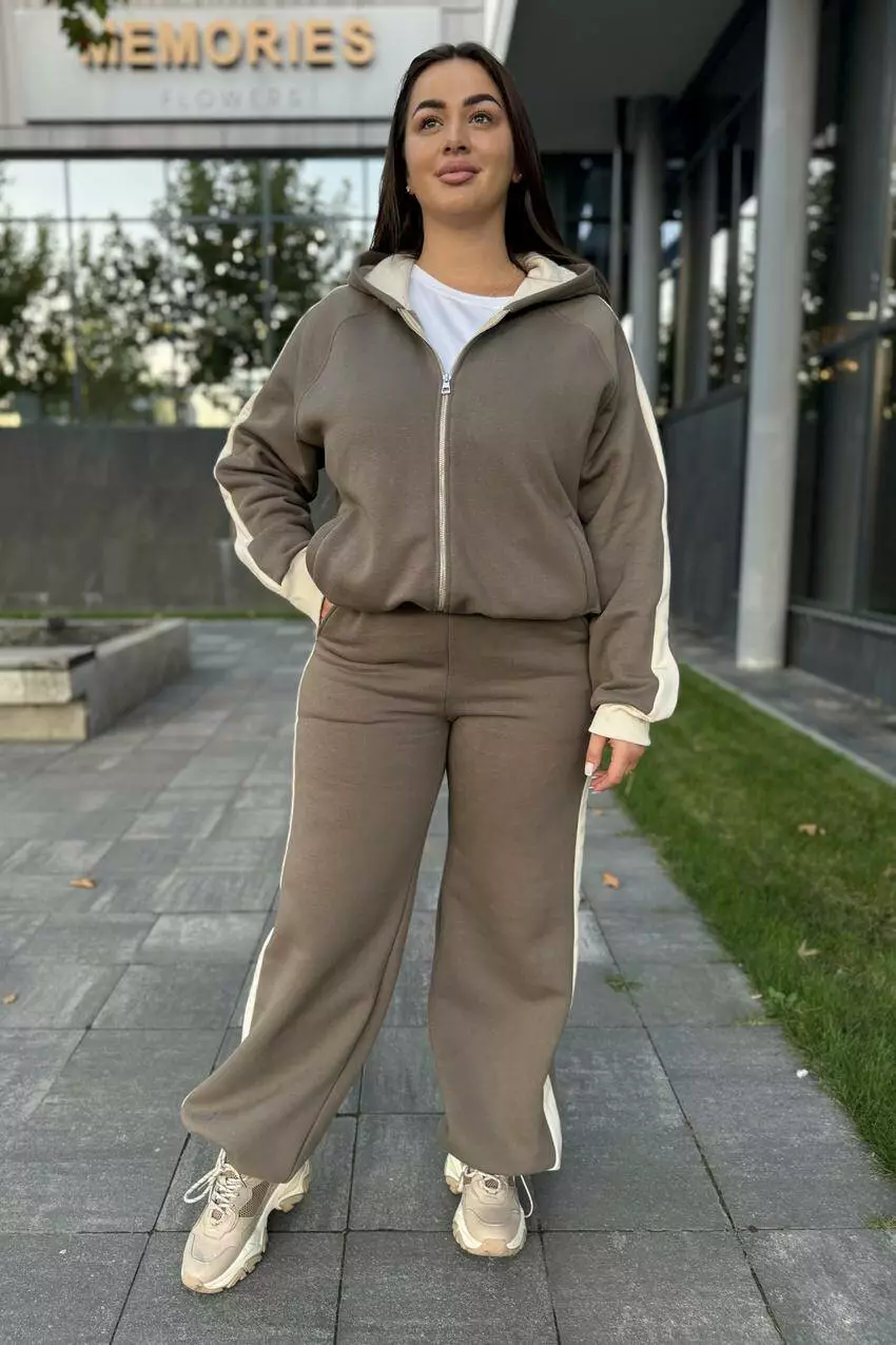 Костюм на замку з капюшоном і начосом Стильний спортивний костюм із м’яким начосом створений для комфорту й тепла у прохолодну погоду. Верх із капюшоном та зручною застібкою-блискавкою забезпечує практичність у щоденному носінні, а завдяки продуманим деталям костюм легко адаптується під будь-який образ. Особливості моделі Кофта на замку з капюшоном — захищає від вітру й холоду, зручна у повсякденному використанні. Затяжки по низу кофти — дозволяють регулювати посадку: носити вільно або підтягнути для створення іншого стилю. Штани з регульованими зав’язками — можна носити прямими чи зібрати на щиколотках. Теплий начіс усередині — дарує затишок і комфорт навіть у прохолодні дні. Переваги Універсальний фасон підходить як для прогулянок, так і для активного відпочинку. Комфортний крій не сковує рухів. Можливість створювати різні стилі завдяки регулюванню низу кофти та штанів.