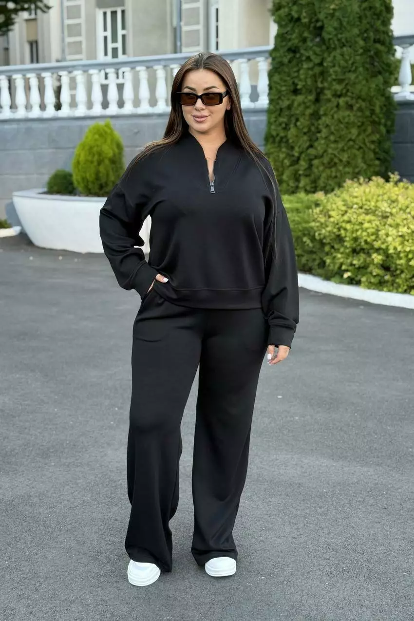 Костюм жіночий з брюками із дайвінгу: прямі штани з кишенями, кофта з горловиною на замку Стильний комплект для щоденних образів і активного відпочинку. Щільний еластичний дайвінг приємно облягає фігуру, не просвічує, тримає форму та зберігає колір після прання. Особливості моделі Штани: прямий крій, середня посадка, еластичний пояс, функціональні кишені. Кофта: високий комір із блискавкою (напів-зип), акуратні манжети, лаконічний силует. Матеріал: дайвінг (скуба-трикотаж) — еластичний, гладкий, комфортний у носінні. Переваги Універсальний фасон: легко поєднувати зі снікерами, черевиками чи кросівками. Практичність: майже не мнеться, швидко сохне, підходить для подорожей. Комфорт руху: тканина розтягується й повертається до форми. Деталі та догляд Склад тканини: поліестер з еластаном (частки можуть відрізнятися залежно від партії). Догляд: прання при 30 °C навиворіт, без відбілювачів; делікатне віджимання; сушка на горизонтальній поверхні; прасування на низькій температурі через тканину. Розмір та посадка Посадка: комфортна, відповідає розміру. Рекомендація: якщо вагаєтесь між двома розмірами — для вільнішої посадки оберіть більший.