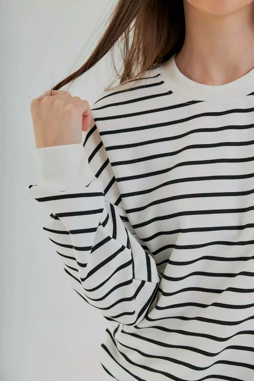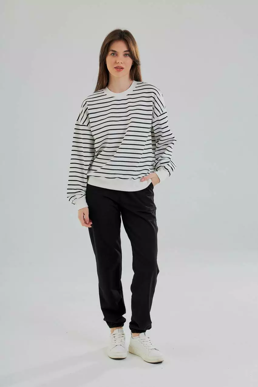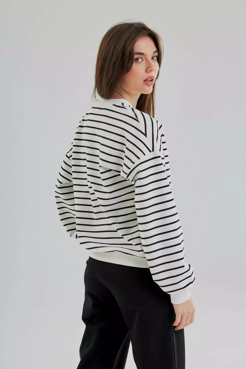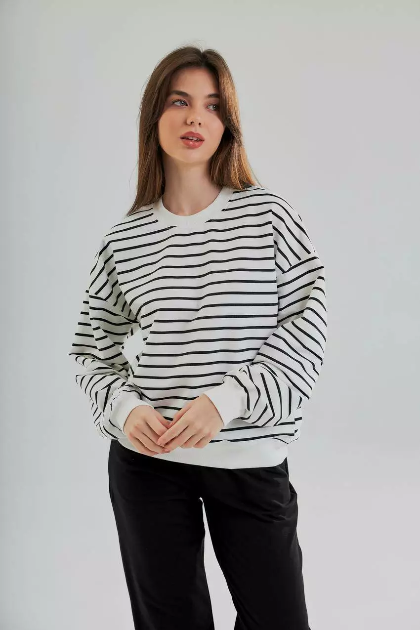 Жіночий світшот з двонитки в смужку — комфорт з ноткою класики Легкий та зручний жіночий світшот зі стильним смугастим дизайном — ідеальний варіант для повсякденних образів. Виготовлений з м’якої двонитки, він забезпечує комфорт у прохолодну погоду та дарує свободу рухів завдяки дихаючій, еластичній тканині. Класичні горизонтальні або вертикальні смужки додають образу динаміки та візуально підкреслюють силует. Світшот має універсальний крій, який пасує до джинсів, штанів, спідниць або шортів. Його можна носити як окремо, так і в багатошарових луках під куртку або пальто. Це ідеальний вибір для навчання, офісу в стилі casual, прогулянок або зустрічей із друзями. Переваги: Легка, дихаюча двонитка — ідеальна на весну й осінь Смугастий принт — класика, що завжди в тренді Зручний крій, що не сковує рухів Універсальний дизайн для різних стилізацій Підходить для щоденного носіння Світшот у смужку — стильний базовий елемент вашого гардеробу на кожен день!