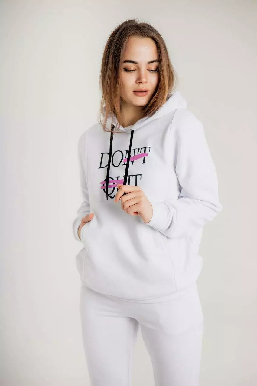 Жіночий костюм з худі та джогерами з написом "Don't quit" — мотивація, стиль і комфорт в одному образі Теплий та зручний спортивний костюм з тринитки стане вашою улюбленою річчю для прогулянок, активного відпочинку або затишного дня вдома. Комплект складається з худі з мотиваційним написом "Don't quit" та зручних джогерів — поєднання функціональності та актуального стилю. Щільна тринитка з начосом забезпечує тепло в осінньо-зимовий період, приємно прилягає до тіла та не сковує рухів. Худі оснащене капюшоном, кишенею-«кенгуру» та еластичними вставками. Надпис "Don't quit" додає енергії й впевненості у кожному русі. Джогери мають комфортний пояс на резинці з зав’язками та зручні кишені — ідеальні для активного способу життя. Костюм чудово поєднується з кросівками або черевиками й підходить як для спорту, так і для casual-луків. Переваги: Тепла тринитка з начосом Худі з капюшоном, кишенею і мотиваційним надписом "Don't quit" Джогери з кишенями та поясом на резинці Комфортний крій для щоденного носіння Ідеальний вибір на осінь та зиму Цей костюм — не просто зручний одяг, а щоденне нагадування не здаватися!