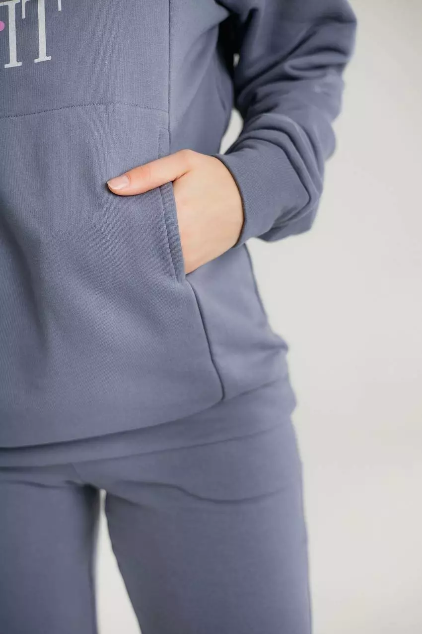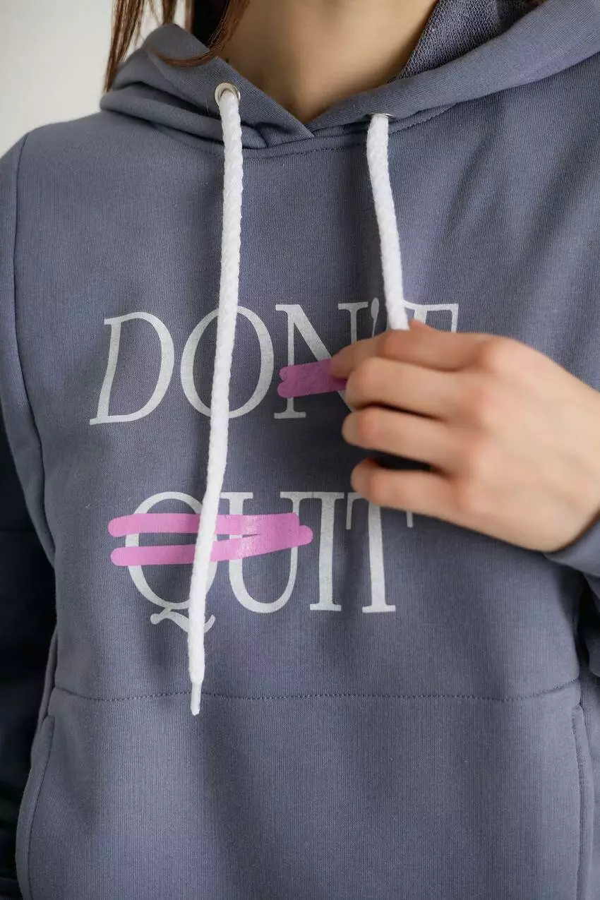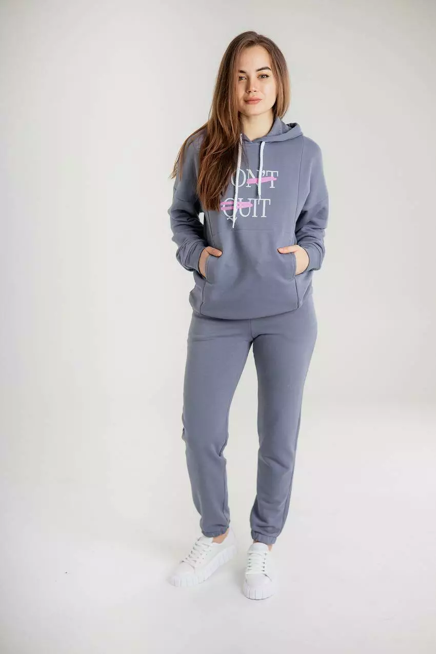 Жіночий костюм з худі та джогерами з написом "Don't quit" — мотивація, стиль і комфорт в одному образі Теплий та зручний спортивний костюм з тринитки стане вашою улюбленою річчю для прогулянок, активного відпочинку або затишного дня вдома. Комплект складається з худі з мотиваційним написом "Don't quit" та зручних джогерів — поєднання функціональності та актуального стилю. Щільна тринитка з начосом забезпечує тепло в осінньо-зимовий період, приємно прилягає до тіла та не сковує рухів. Худі оснащене капюшоном, кишенею-«кенгуру» та еластичними вставками. Надпис "Don't quit" додає енергії й впевненості у кожному русі. Джогери мають комфортний пояс на резинці з зав’язками та зручні кишені — ідеальні для активного способу життя. Костюм чудово поєднується з кросівками або черевиками й підходить як для спорту, так і для casual-луків. Переваги: Тепла тринитка з начосом Худі з капюшоном, кишенею і мотиваційним надписом "Don't quit" Джогери з кишенями та поясом на резинці Комфортний крій для щоденного носіння Ідеальний вибір на осінь та зиму Цей костюм — не просто зручний одяг, а щоденне нагадування не здаватися!