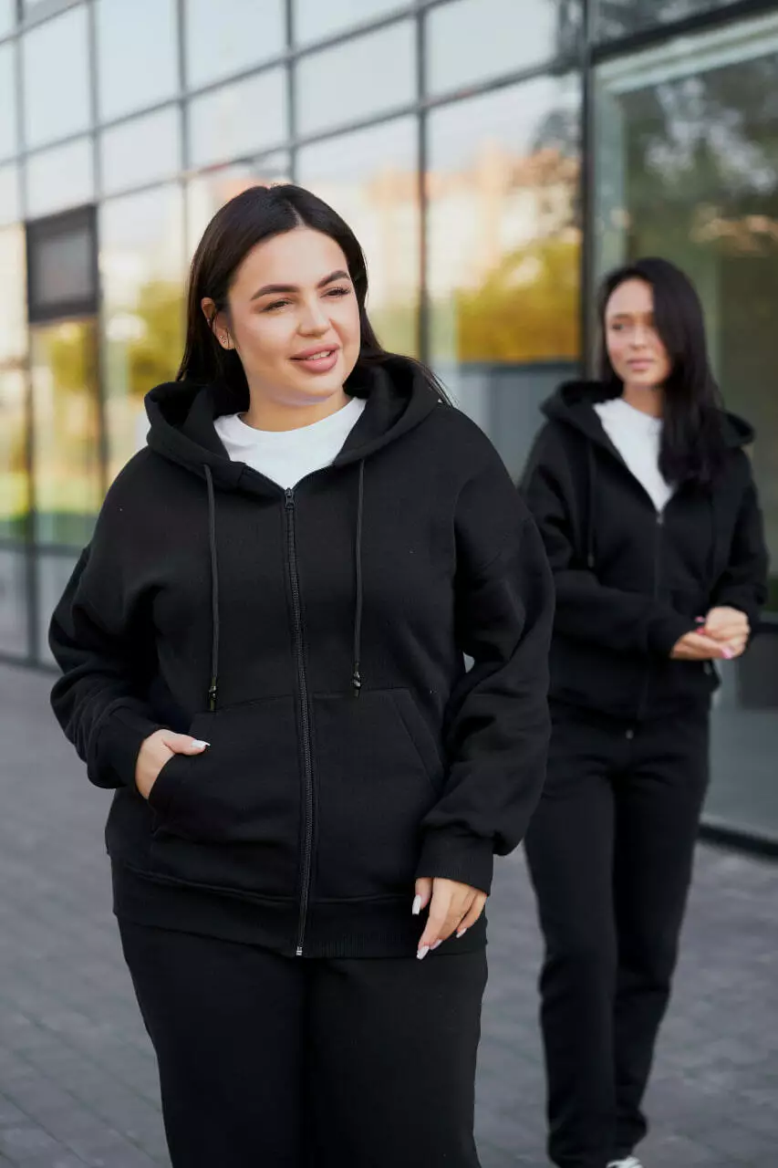 Жіночий спортивний костюм із начосом (худі на замку + джогери) Стильний та універсальний жіночий спортивний костюм із начосом стане незамінною частиною вашого гардеробу. Комплект, що складається з худі на замку та джогерів, ідеально підходить для прогулянок, подорожей або активного відпочинку в осінньо-зимовий сезон. Худі з капюшоном має зручну застібку-блискавку та манжети на рукавах і по низу виробу, що забезпечує максимальний комфорт. Джогери з еластичною гумкою в поясі та понизу штанин доповнені функціональними кишенями, що робить цей костюм практичним та зручним. Завдяки своєму лаконічному дизайну та теплому трикотажу з начосом, костюм легко комбінується з різними елементами гардеробу, що дозволяє створювати як спортивні, так і більш вишукані образи. Особливості: Комплект: худі на замку + джогери Зручні манжети та капюшон Еластична гумка в поясі та понизу штанів Практичні кишені для зручності Цей костюм поєднує комфорт і стиль, роблячи його ідеальним вибором для активного способу життя! Розмірна сітка S M XL Довжина кофти 67 67 70 Ширина кофти 52 54 60-61 Довжина рукава від капюшона 74 75 78 Ширина резинки у стягненому стані 33 34 38 у розтягнутому 43 45 53 Ширина стегон 50 53 59 Довжина штанів по зовнішньому шву 103-104 105 107 по внутрішньому 74 76 79