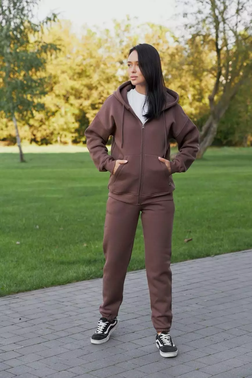 Жіночий спортивний костюм із начосом з худі на замку та джогерами М136.4, мокко S